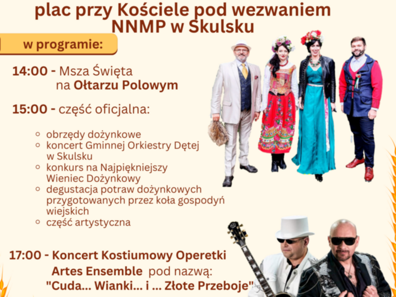W dniu 3 września 2023 roku odbyły się Dożynki Gminno – Parafialne w Skulsku. Wszystkich gości witały piękne i różnorodne dekoracje dożynkowe. Starostami tegorocznego święta plonów byli Kamila Stanisławska i Marcin Kluczyński. Dożynkowe świętowanie rozpoczęto uroczystą Mszą Świętą odprawioną na ołtarzu polowym przy Kościele pod wezwaniem Narodzenia Najświętszej Maryi Panny w Skulsku koncelebrowaną przez ks. proboszcza Krzysztofa Antczaka, na której dziękowano za tegoroczne zbiory. Podczas Mszy Świętej starostowie dożynek, a następnie przedstawiciele wsi złożyli chleb na ręce proboszcza oraz Wójta Andrzeja Operacza. Ks. proboszcz oraz Wójt podziękowali rolnikom za ciężką pracę, za całoroczny trud i wysiłek. Tradycyjnie po mszy świętej Wójt, starości oraz przedstawiciele wsi podzielili się poświęconym chlebem z wszystkimi uczestnikami uroczystości.