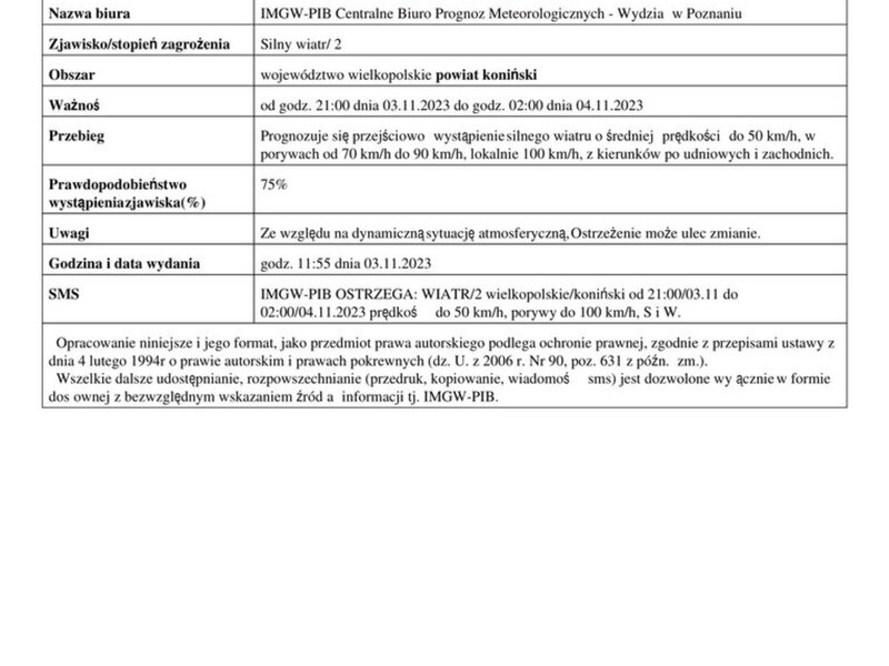 Komunikat ostrzegawczy - silny wiatr.