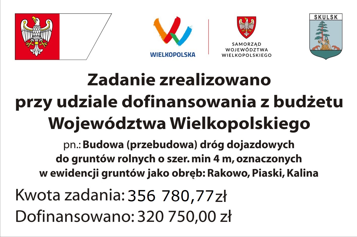 Gmina Skulsk zrealizowała do dnia 30.11.2023r. zadanie pn. „Budowa (przebudowa) dróg dojazdowych do gruntów rolnych o szer. min. 4 m oznaczonych w ewidencji gruntów jako obręb: Rakowo, Piaski, Kalina”.