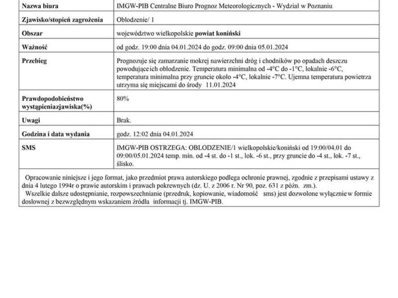 Komunikat ostrzegawczy - oblodzenie.
